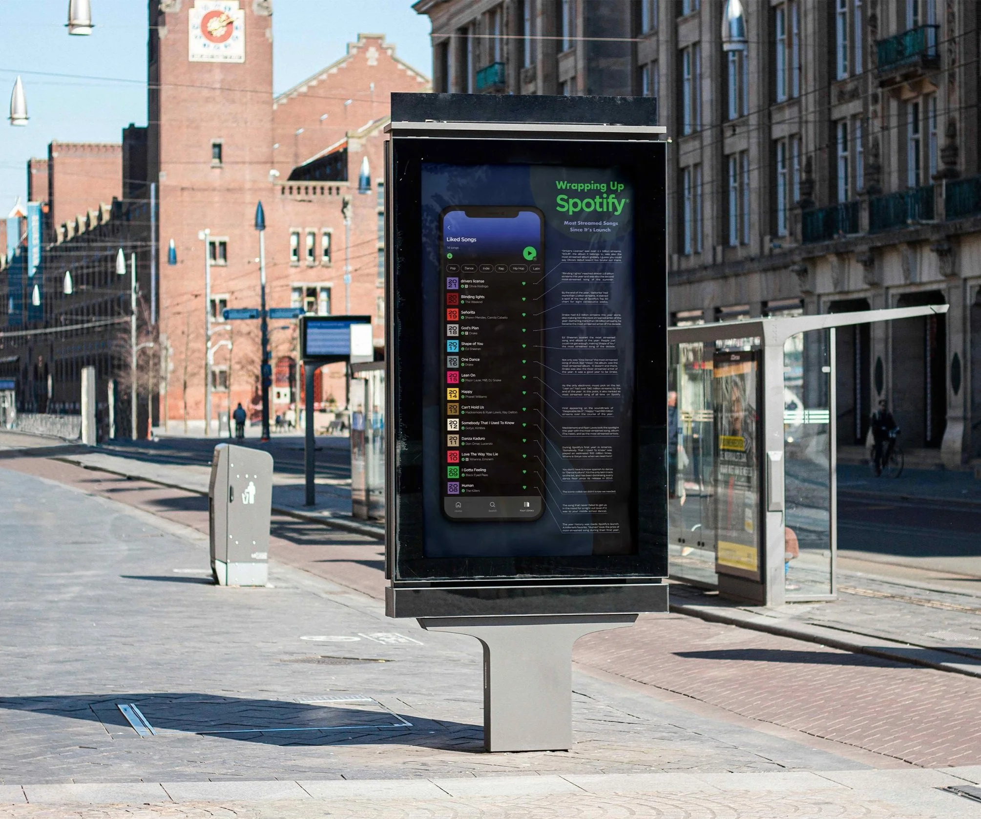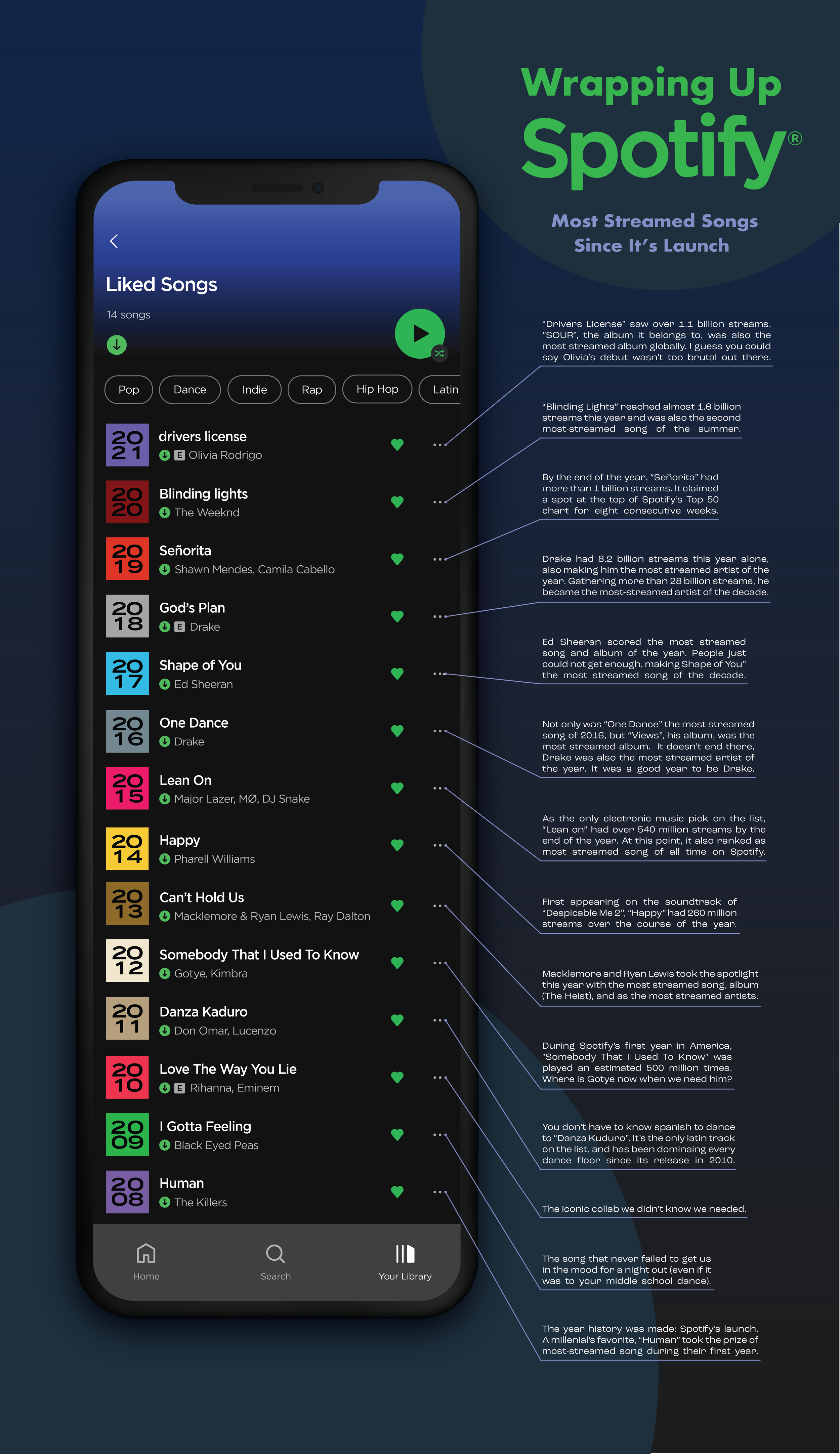 Timeline poster design showing Spotify's most streamed songs since its launch. Created with Adobe Illustrator, 2022.